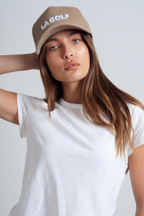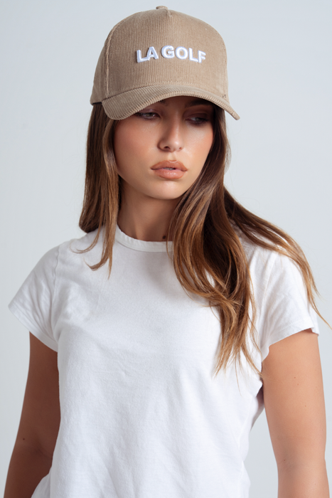 Five-panel mid-profile adjustable hat with a plastic snapback closure and a one-size-fits-most design. Corduroy fabric with white embroidered logo.